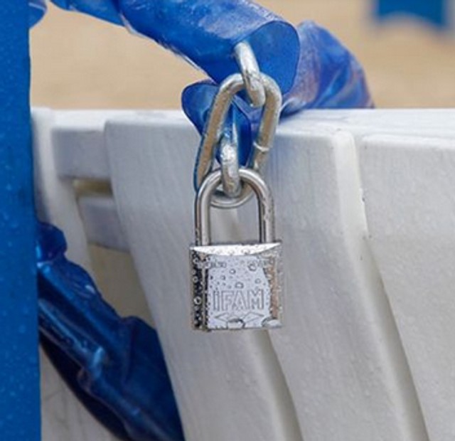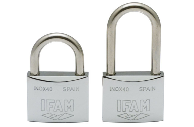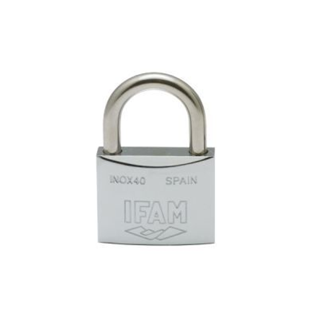 The IFAM Inox Padlock features a rust-resistant brass body with nickel and chrome plating,